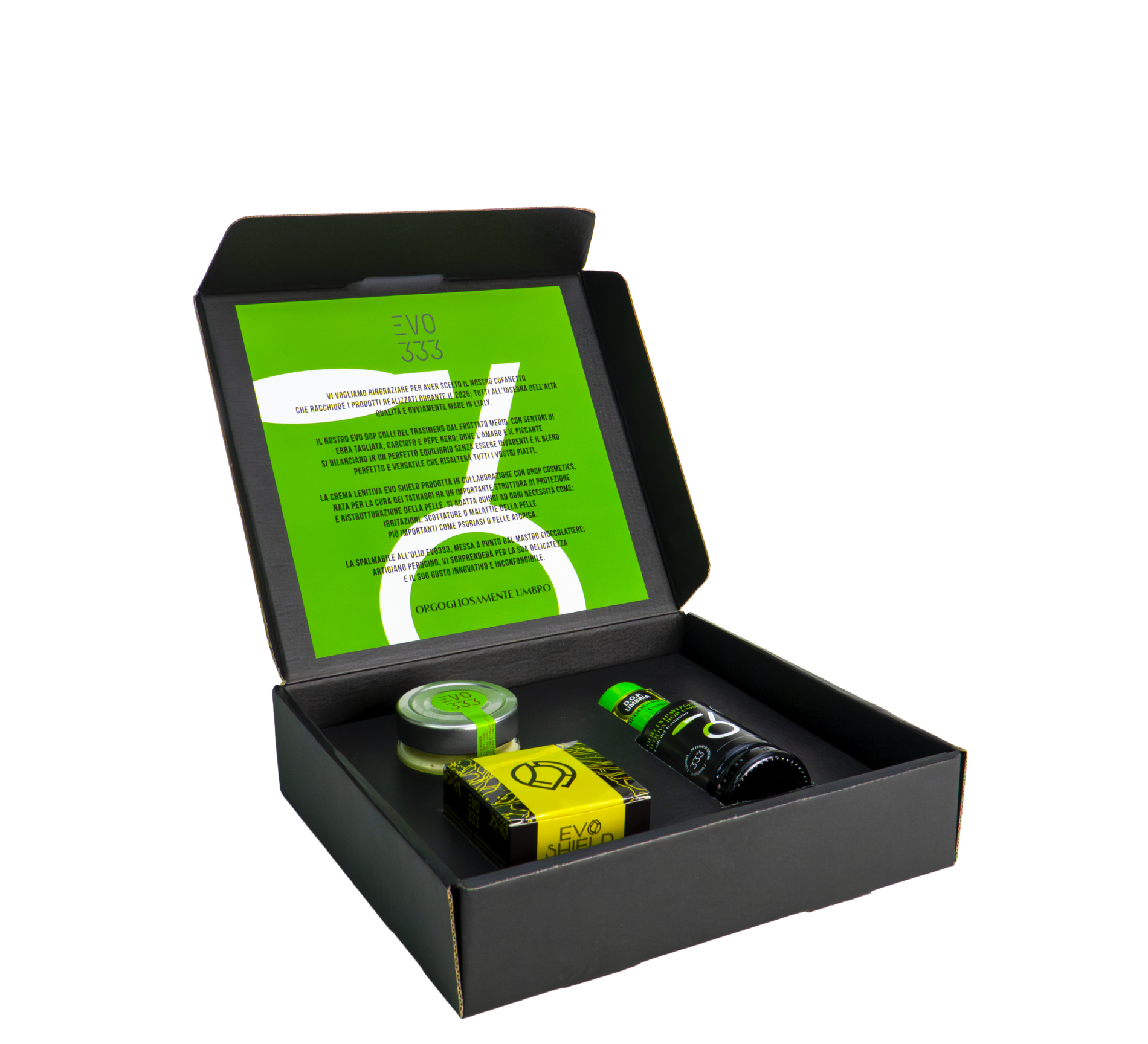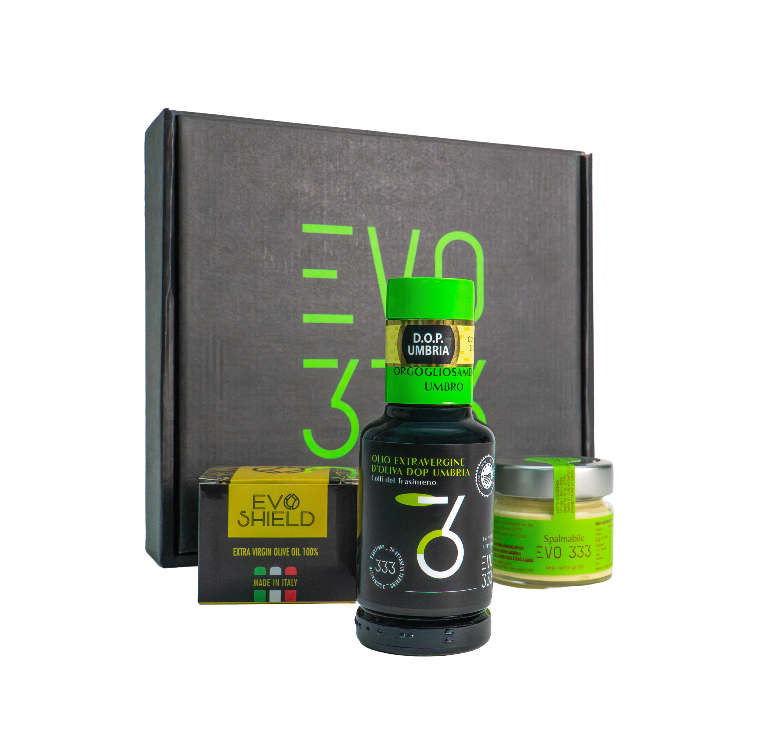EVO333 Experience Box, la confezione che racchiude tre prodotti unici nati nel cuore verde dell’Umbria: l’Olio EVO DOP 10 cl, la Crema Spalmabile EVO333 e la Crema Protettiva EVOSHIELD EVO333. Un percorso sensoriale e di benessere che unisce tradizione agricola, qualità artigianale e cura della persona.